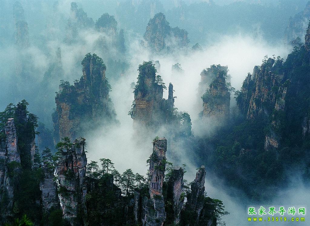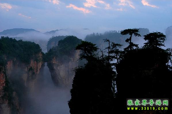 在“后花園”的對面,是一座巍峨的山巒,山上古木參天,遮天蔽日。森林中常有野山羊出沒,夜深人靜之際,常能聽到野羊羔“咩洋”地叫聲,因此被稱作“羊寨”。民國時(shí)期,此地曾為土匪占領(lǐng),直到現(xiàn)地,山上還殘留有卡門、暗堡、斷壕、屋場、水井、碓臼、磨坊等殘跡。粗大的松樹上還留有土匪當(dāng)年留下的“V”字型標(biāo)志。站在“山寨”上,舉目眺望,可看見金鞭溪全景,只見一條美麗的溪水從數(shù)百座石林中緩緩穿過,顯得是那樣的幽靜、和諧。從“后花園”向前步行約100米,便是袁家界又一處絕世奇觀——迷魂臺(tái),走上迷魂臺(tái),只見上百座山巒拔地而起,峰涌而至,它們姿態(tài)萬千、氣勢非凡;有的似“天狗望月”,有的像“海螺出水”;有的像“將軍列隊(duì)”,有的如“一柱擎天”。幾道山坳和屏障將這些山巒有序的分開,使這些石峰更顯得層次分明,井然有序,在萬道霞光的點(diǎn)綴下,顯得蔚為壯觀,不同凡響。這更像是一幅畫家筆下的水墨丹青,“迷魂臺(tái)”攬勝,真宛如仙境神游啊。