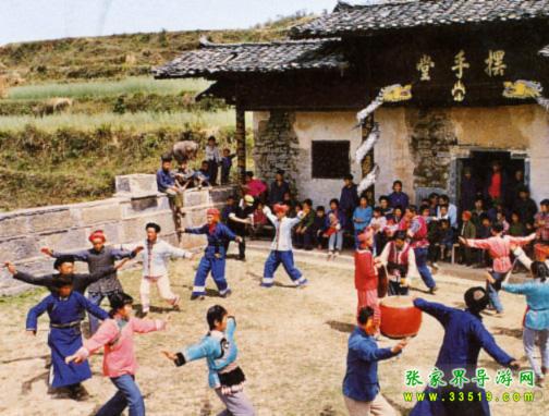 “茅古斯與擺手舞”是土家族紀念祖先開拓荒野、捕魚狩獵等創(chuàng)世業(yè)績的一種原始戲劇形式,被中外的戲劇界稱為是人類戲劇文化的“活化石”,茅古斯是土家族最古老的舞蹈,也是傳授狩獵技藝的民間武術,體現(xiàn)土家族先民的生活情態(tài)。