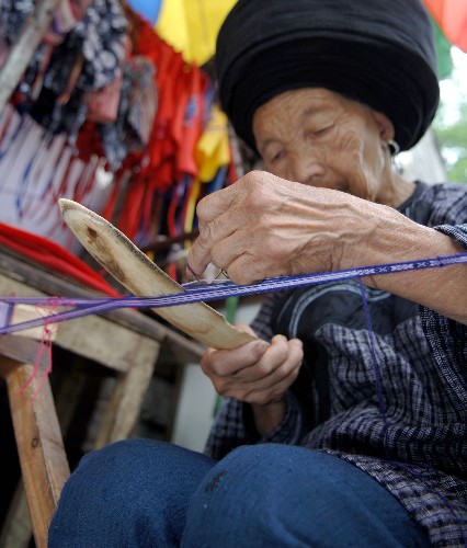 織花帶,據(jù)有關(guān)史書(shū)記載:“南蠻斷發(fā)紋身,以示與龍蛇同類(lèi),免其傷害。”原來(lái),苗家姑娘織花帶是為了防蛇傷身,所織花帶以假亂真,其花紋形同蛇樣,使蛇誤認(rèn)為是同類(lèi),使人不受其害。怪不得本書(shū)作者在苗家做客時(shí),曾聽(tīng)到一個(gè)美好的傳說(shuō):在古代,因居住在苗嶺山區(qū)的人經(jīng)常遭受毒蛇的傷害,便有一個(gè)美麗聰明的姑娘想出了一個(gè)辦法,她見(jiàn)蛇遇同類(lèi)便迅速離開(kāi),就仿照蛇的花紋編織了約一寸寬的一種花帶。這種花帶平時(shí)上山纏在身上,如遇毒蛇就取下花帶對(duì)蛇一擺弄,這樣毒蛇見(jiàn)了以為是同類(lèi),便迅速離開(kāi)了。這個(gè)辦法很靈,使許多苗家人免受了傷害。自那以后,苗族織花帶也就一代一代傳下來(lái)了。苗族花帶經(jīng)代代相傳,越織越快,越織越美,它由原來(lái)單一的為了防止蛇傷發(fā)展到現(xiàn)在的多種用途,如作為青年戀愛(ài)的信物,饋贈(zèng)親友的禮品,也用于提包的背帶和一部分家具的裝飾等等。花帶的圖案紋樣也越來(lái)越豐富了,有表現(xiàn)吉祥與愛(ài)情生活的,如《雙喜臨門(mén)》、《五谷豐登》、《鴛鴦戲水》等,也有表現(xiàn)花卉的,如《秋菊》、《蘭草》等等。苗族姑娘編織花帶的工藝也有進(jìn)步,以前織一根花帶,要幾天,現(xiàn)在,只見(jiàn)她們手拿一根牛骨針(也有用銅針與銀針的),如流星閃爍一般,揮針走線,一根一米長(zhǎng)的花帶很快就織成了。 苗族同胞特別好客,他們很講禮貌,重感情、守諾言,待人誠(chéng)懇、憨厚樸實(shí),不虛偽。他們歷來(lái)主持正義,扶正斥邪,路見(jiàn)不平,撥刀相助、赴湯蹈火,在所不辭。