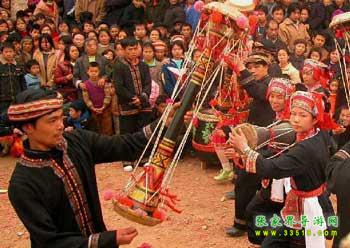 然而,好景不長(zhǎng),“長(zhǎng)毛鬼”看到人間生活富裕,便起了嫉恨之心。他唆使雷公趕走了龍,從此,苗家人的生活便苦了,年年天干,莊嫁旱死,人畜連喝水都十分困難。沒(méi)有辦法,他們只好拄著拐杖上山求雨,求雨不成,唯有接龍回來(lái)才行。于是,苗族人民想龍、盼龍,每年都于二月二、六月六或九月九舉行“接龍”儀式,載歌載舞。這就是苗族“接龍舞”的來(lái)歷。 “接龍舞”首先由“龍師”手捧瓷碗作前導(dǎo),接著是數(shù)名代勾(男童)分不兩隊(duì),手持紅綠兩色條旗,走成龍形,還有紅衣老司(巫司),手舞司刀,揮動(dòng)柳旗,一路上驅(qū)趕“長(zhǎng)毛鬼”,隨后而來(lái)的是一群群的瑪汝黛帕(年輕美麗的姑娘,一般一群分為八人、二十八人、四十八人與八十八人不等),穿著艷麗的花邊衣,花邊裙,花邊鞋,還打著花邊傘,拿著花邊手帕,頭上盤(pán)發(fā)辮,戴銀飾,胸前配戴銀質(zhì)“長(zhǎng)命鎖”,翩翩起舞,旋轉(zhuǎn)花傘,接龍降雨。他們的舞蹈動(dòng)作有:敬天神、盼龍回、龍翻身、龍穿衣、龍搶寶,然后就是接龍入龍門(mén),拋粑粑。這時(shí)候,苗家的桐皮長(zhǎng)號(hào)、包谷銅鑼、嗩吶、牛角、大鼓等各種樂(lè)器都一齊奏響,還伴隨著吹木葉、唱苗歌等等,是最熱鬧的時(shí)候,表示龍接回來(lái)了,苗家的生活又好了。它反映了苗族人民對(duì)未來(lái)幸福的憧憬與追求。