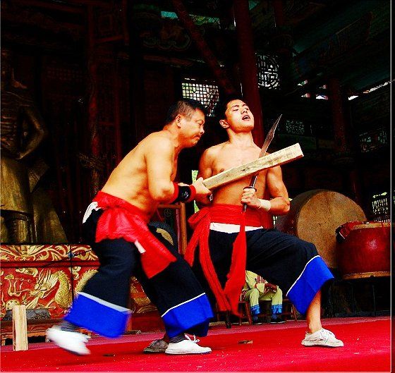大庸氣功 大庸氣,堪稱武林奇葩,曾為祖國贏得聲譽,海內(nèi)外享有極主名望。 大庸氣功是大庸各民族特別是土家族傳統(tǒng)體育項 目之了,分健體氣派、武術(shù)氣功兩類。前者有“返還 功”、“馬王推氣功”、“少林達摩醫(yī)療保健氣功” 等;后者有靜坐、壁虎、靈子、二指彈、碎石、松靜 、硬氣、五禽、五陽功等,尤以硬氣功著稱。大庸硬 氣功,歷史悠久,漢代相單程,明代覃后,清代劉明 燈,當代湯子模、周鐵鞭、杜心武、趙繼書等都具有 超人硬氣武功。大庸土著民族在漫長的反征服、反壓 迫斗爭,博采武當、少林南北派、昆侖派眾家武林精 華,創(chuàng)造出獨此一家的大庸硬氣功。 據(jù)傳,大庸硬氣功鼻祖是楚國鬼谷子?!?a class="insidelink" href="http://m.xurichangsheng.com/cityinfo/15580531721.html" title="永定區(qū)">永定縣 志》有關(guān)鬼谷子隱居天門山鬼谷洞潛心學《易》、傳 授方術(shù)的記載。到清代有武林高手朱茂嶺,隱居三岔 村北芭蕉灣洞,研究鬼谷氣功之術(shù),后收西溪坪胡口 子、余世萬(即“余通人”)為徙,傳其衣缽。余通 人將武術(shù)氣功系統(tǒng)整理,發(fā)揚光大,播名于世。 新中國成立后,黨和政府十分重視民間氣功發(fā)掘 整理,并正式列為體育項目加以普及發(fā)展,今日大庸 市習練硬氣功達數(shù)萬人眾。永定區(qū)官黎坪村世有“硬 氣功之鄉(xiāng)”盛譽,該村男女老幼,練功已蔚成風氣, 其武師趙繼書,1979年先后參加全省和全國武術(shù)大賽 ,均獲一等獎,受到國家體委重視,同年7 月趙繼書 專程到北京給中央領(lǐng)導同志匯報表演。嗣后,隨同中 國武術(shù)代表團和國家領(lǐng)導人先后兩次出國,到盧森堡 、意大利、比利時、羅馬尼亞、馬其他和東南亞等國 家訪問。他表演的臥刀碎石、頭頂開石、雙鳳灌耳、 頭碰石柱、叉尖推磨等精彩節(jié)目,博得外國友人好評 。盧森堡一位榮獲國家獎牌的武士,看了表演后連夜 來到中國大使館,將自己珍藏多年的獎牌贈送給他; 盧森堡國王主動熱情走上臺與趙繼書熱情擁抱,連連 稱贊:“了不起!了不起!國際氣功大師!”并把珍 藏紀念章一枚贈送給趙繼書。一位法國朋友十分贊賞 說:“中國的氣功,稱為全人類的寶貴財富,是有科 學道理的。”自此,大庸硬氣功譽滿全球。湖南瀟湘 電影制片廠專門拍攝了彩色紀錄片《大庸氣功》。 大庸硬氣功共有二十多個項目,最有影響的是: 腹臥鋼叉 由二人在地面扶住一根叉尖朝上的三 股鋼叉,叉尖猁鋒利,然后一個俯身叉尖,尖抵腹部 ,待其四肢平展懸空,扶叉二人轉(zhuǎn)動鋼叉,謂之推磨 。表演時,要求臥叉者運氣于腹,氣意集中,稍有大 意,叉即穿腹而過。 臥刀破石 先固定兩把大刀,刀口朝上,臥刀者 運氣后,由其他人抬臥于刀口上(有仰臥、俯臥兩種) ,然后在臥刀者腹部或背部置一碩大石條(約數(shù)百斤) ,一人或兩人輪大鐵錘狠擊石條直至斷裂破碎為止。 釘?shù)洞财剖?地上倒一層碎玻璃片,一人仰臥其 上;然后腹上置釘床,又一人仰臥釘床上,再于第二 人腹上置釘床,第三人仰臥刀床上,腹部上壓一塊數(shù) 百斤大條石,由人掄錘狠砸,至石破為止。 銀槍刺喉 用一根兩頭安有鋒利槍頭的鋼槍,抵 置兩位表演者喉部,然后相對發(fā)力,至槍桿抵成彎弓 形而喉部安然無恙。 徙手斷石 表演者將堅滑如鐵一塊卵石置于石凳 (地)上,然后運氣于掌或指擊斷(碎)卵石。 踢腿斬石 表演者運氣于腿,以腿踢斷石條。一 般可踢斷15公分以上厚度的麻石條或青石條。 胸部打刀 將鋒利大刀刃口置于胸部肌肉上,用 一根拳頭粗木棒猛擊刀背,至棒斷而胸部無傷。 新中國成立以來,大庸民間武術(shù)與民族體育逐漸 融為一體,發(fā)揮著提高人民身體素質(zhì)、弘揚中華武術(shù) 傳統(tǒng)和增進國際友誼重大作用。除硬氣功外,還有數(shù) 十種武術(shù)形式散見于民間武術(shù)體育活動之中。如打飛 棒、扭扁擔、抵搭斗杠、擠油渣、甩抱腰、舉石鎖、 板牛角(一種斗牛形式)等等。其特點是因地制宜, 不分場地,凡田園地角院壩集鎮(zhèn),都是習武練功、開 展活動的處所,頗具泥土氣息。擬或以生活中某些動 作和動物的某種形態(tài),稍加模仿演繹,便成某一獨特 武術(shù)形式。如天門武術(shù)功夫大師余道人所創(chuàng)造的“宮 天梳”、“巖燕樸天門”等;也有就地理特點創(chuàng)造某 種武功形式的,如“蕩藤”等。 以上部分圖片均來自互聯(lián)網(wǎng),出處不詳,請作者與本站聯(lián)系。 |