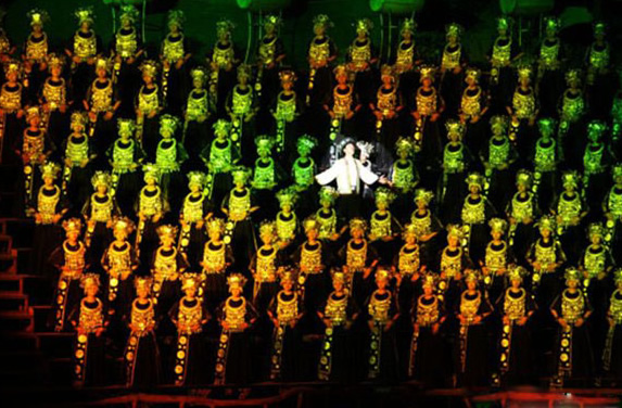 以此基礎(chǔ)進(jìn)行了藝術(shù)再創(chuàng)造,悲傷、歡樂(lè)、笑容、淚水交合成一個(gè)曲折動(dòng)人的故事。整場(chǎng)演出體現(xiàn)人物細(xì)節(jié),以個(gè)性化的敘事結(jié)構(gòu)給人以親近感和頭尾呼應(yīng)的完整感。汲取世界豐富的音樂(lè)文化元素和表現(xiàn)形式,輔之以現(xiàn)代高科技的舞臺(tái)特效技術(shù),對(duì)世界音樂(lè)歌舞劇的一次成功的創(chuàng)新,成為中國(guó)山水實(shí)景演出的劃時(shí)代巨獻(xiàn)。