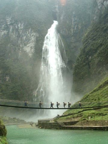 瀑水從斧削狀絕壁上的溶洞奪口噴出,飛流直下,聲如霹靂,數(shù)里可聞,整個山谷煙云彌漫,霧氣蒙蒙,遠(yuǎn)看瀑布如白練懸空,近看似銀河瀉天際。每當(dāng)陽光照耀時,五光十色的浪花似彩虹凌空飛舞,艷麗奪目,蔚為壯觀。瀑高214m,建有一電站。