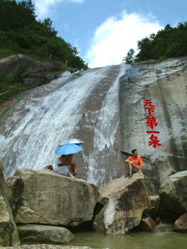 水簾洞瀑布源頭,在紫蓋峰的泉水。三支泉水匯集一起,流入水簾洞上方谷地。谷地闊三丈,原是梁朝的九位真人白日飛升的棲息之地,后建造九仙觀。九仙觀附近有太陽泉、洗心泉、洞真源、仙人池等。相傳泉水深不可測。泉水從石壁上飛流直瀉,發(fā)出雷鳴般的聲音,聲傳十里。明朝張居正游此地后說:“瀑泉灑落,水簾數(shù)疊,掛于云際,垂如貫珠,霏如削玉”。確實,它從絕壁上噴瀉下來,寬達三太,高五十余米,瀉珠濺玉,仿佛一幅巨大的白布簾,在石壁當中被亂石嶙巖擋住,然后再從石縫里屈曲折射,跳躍出來,滿谷水花四濺,閃爍著晶瑩奪目的光彩。水簾絕壁下的碧潭,天上的云彩和兩邊的蒼翠的山巒,構(gòu)成一幅美麗的山水畫。明朝張居正作《水簾洞》一贊道:“誤疑瀛海翻瓊浪,莫擬銀河倒碧流;自是湘妃深隱處,水晶簾掛五去頭”。這首詩可說是寫出了水簾洞的光、聲、影三絕的奇景了。