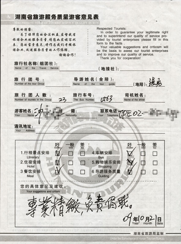 2009年10月18日沙先生一行23人接待質量反饋單:
