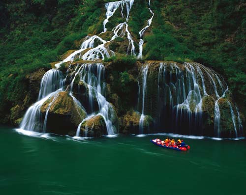 在金鞭溪游覽過(guò)程中,可見(jiàn)一組奇峰,有兩座較高的石峰緊密相連,下半截連為一體,上半截一高一矮,高者略欠身,低者稍后仰,好一幅相愛(ài)擁抱的絕妙畫面,恰似一對(duì)久別重逢的夫妻,故名相會(huì)峰,亦稱千里相會(huì)。相傳東海龍宮小龍女常來(lái)此地觀賞風(fēng)景,一次偶然的機(jī)會(huì),結(jié)識(shí)了峨眉山遠(yuǎn)道而來(lái)的后生,二人情投意合,很快便產(chǎn)生了愛(ài)情。龍王知道此事以后,非常惱怒,決意拆散二人,多次將小龍女關(guān)在龍宮,但小龍女想方設(shè)法逃出來(lái),常常與情人相會(huì)。龍王一氣之下,將二人點(diǎn)化成石,便成石峰“千里相會(huì)”。 十一、茅巖河漂流
