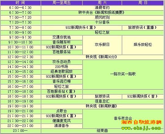 張家界旅游交通頻道茲定于四月八號(hào)試播,頻率為FM93.2兆赫和103.2兆赫。頻道以立足旅游交通、服務(wù)百姓大眾為宗旨,設(shè)置了《清晨有約》、《順風(fēng)時(shí)刻》、《932新聞快報(bào)》、《輕松之旅》、《交通你我他》、《百姓服務(wù)站》、《歡樂總動(dòng)員》和《音樂隨車聽》等欄目。屆時(shí),聽眾可以通過熱線電話、短信平臺(tái)以及網(wǎng)絡(luò)廣播等多種途徑參與到電臺(tái)節(jié)目中來(lái),在第一時(shí)間了解新聞動(dòng)態(tài),掌握市場(chǎng)信息,享受娛樂休閑。 直播熱線:0744——2116999 熱線電話:0744——2116777 廣告熱線:0744——8235800 地址:張家界是永定區(qū)廣電局四樓(解放路27號(hào)) 怎樣收聽張家界旅游交通頻道FM93.2