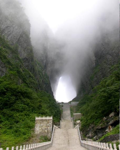 天門山上有一個(gè)天門,2006年03月,曾有俄羅斯之戰(zhàn)斗機(jī)在此表演飛躍天門的表演,還造成滿大的轟動(dòng)。上天門之前,必須先征服999個(gè)階梯,經(jīng)過一番努力終于登上天門之后,突有豁然的感覺,人在山上,卻仍然在中,從這里更可以鳥瞰整個(gè)張家界市的景色。用完晚餐后,即乘車從張家界回車長沙。